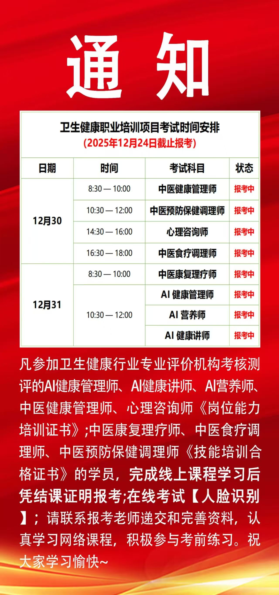 通知:重庆卫生健康职业培训项目考试时间安排