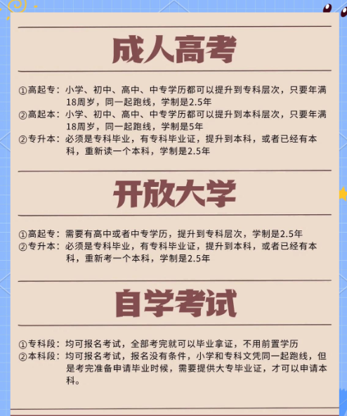 在知识经济时代,学历是职场晋升、考公考编、积分落户及个人发展的硬性门槛。面对日益激烈的职业竞争,系统性学历提升已成为打破发展瓶颈、拓宽人生选择的战略性投资。无论是专科、直本还是高效的专本套读,获得国家承认、学信网可查的高等学历,都将为您开启职业发展的新篇章,赋予未来更多的可能与机遇。